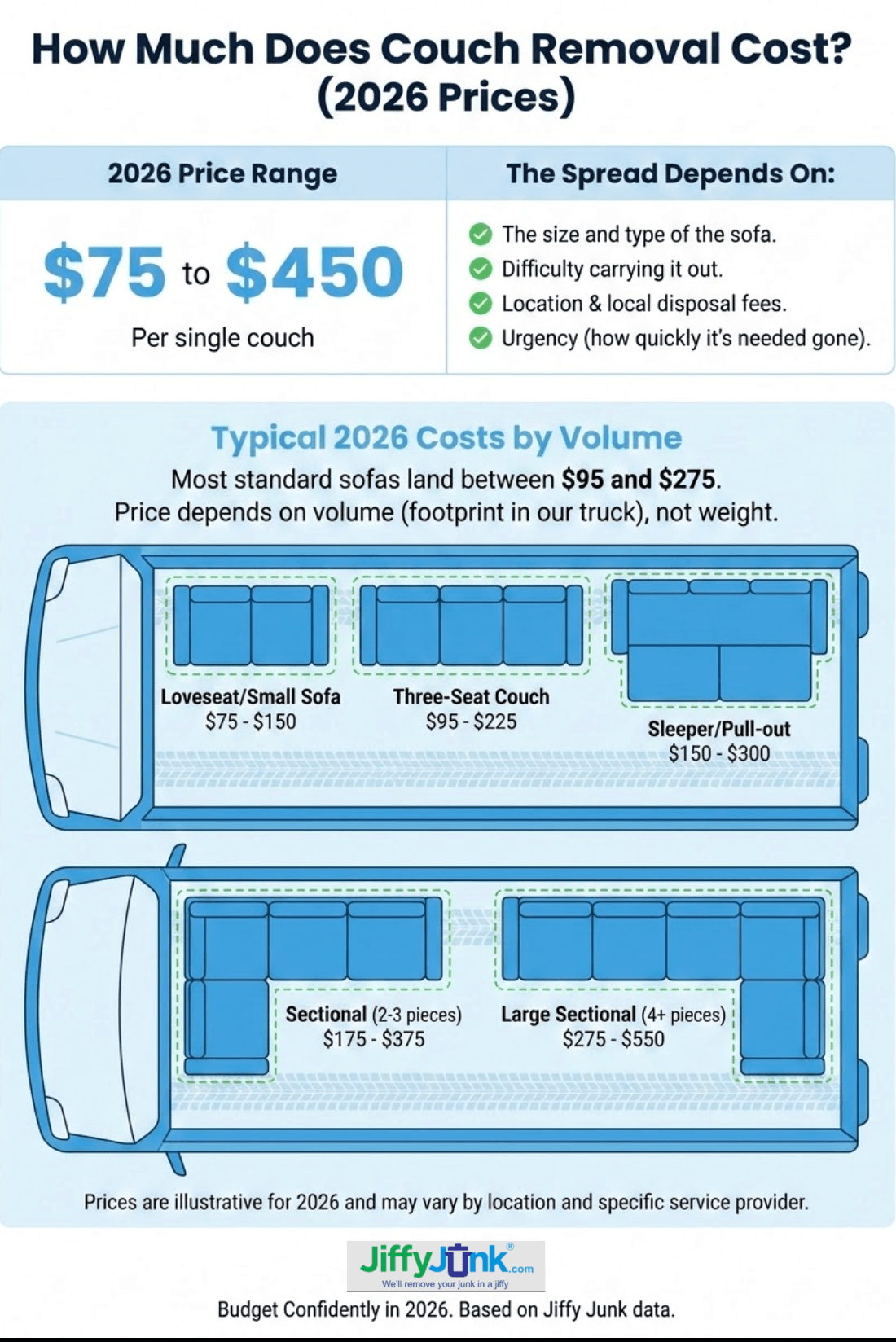 • Single couch removal runs $75 to $450 in 2026, with most standard sofas quoted at $95 to $275.