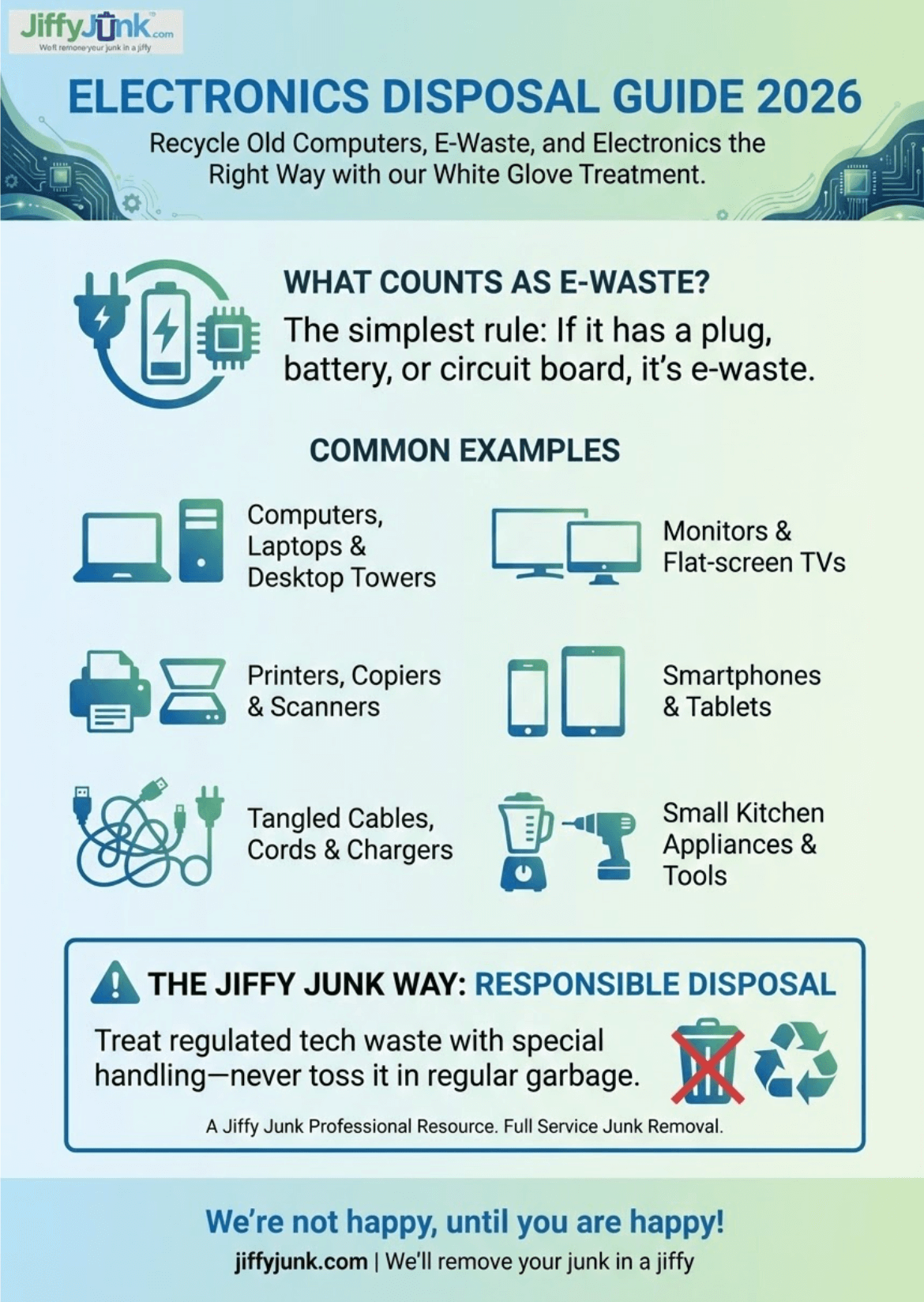 “After removing thousands of loads of old electronics from homes and businesses, the biggest thing we’ve learned is that most people want to do the right thing with their e-waste. They just don’t know where to start. That’s exactly why we built our process around making responsible disposal the easiest option, not the last resort.” — Jiffy Junk Team