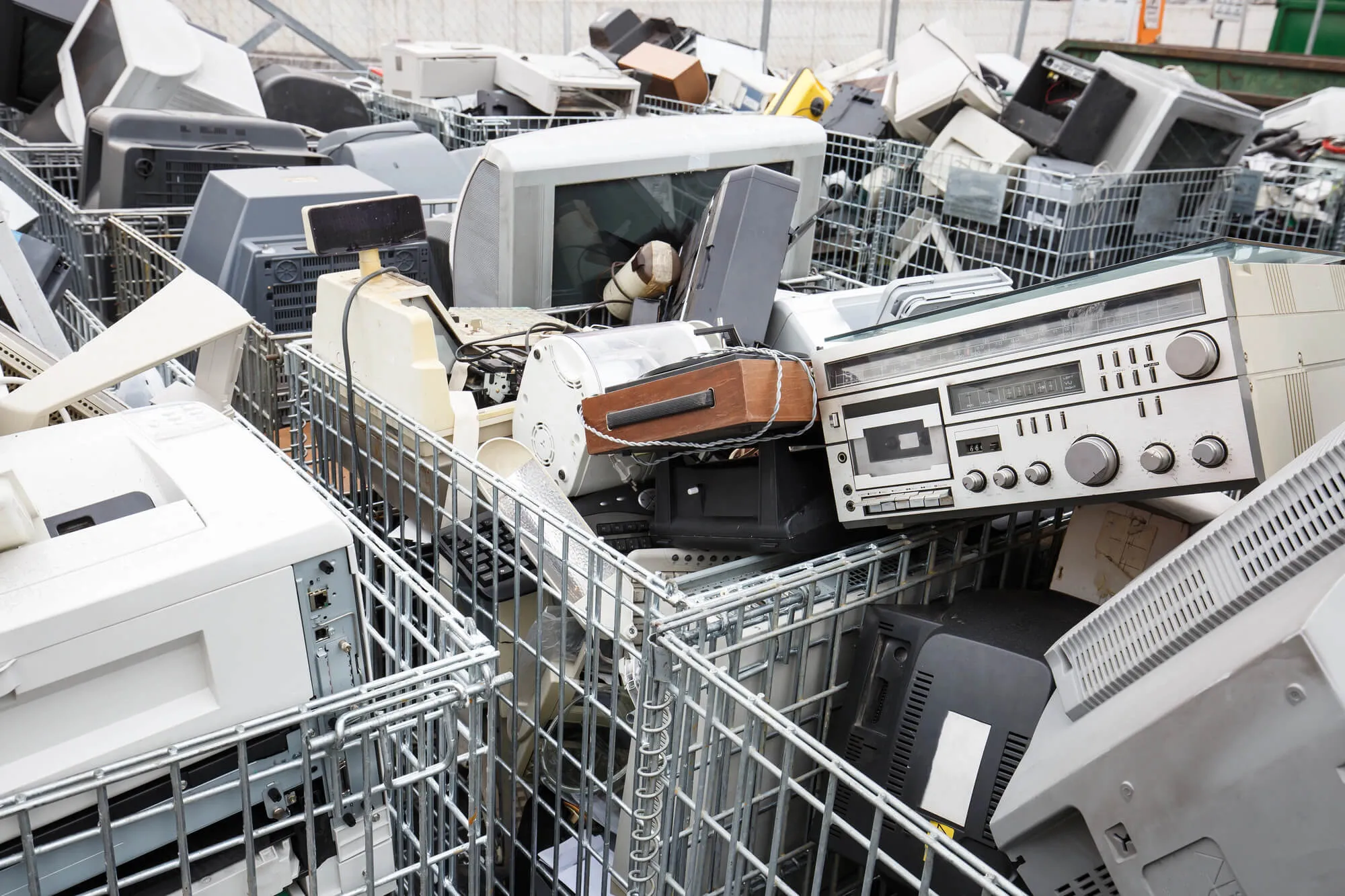 An image of discarded TVs, computer towers, and small appliances in a metal cage for e-waste collection, showing how to recycle electronics responsibly