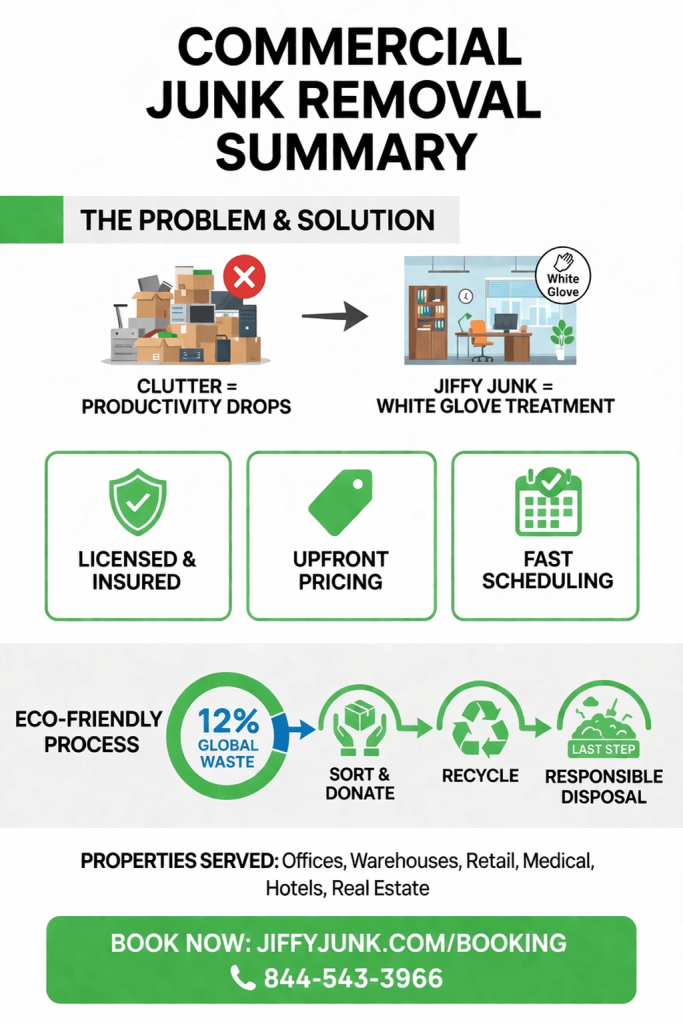 Call 844-543-3966 or book at jiffyjunk.com/booking. Same-day and next-day availability in most service areas, upfront pricing with zero hidden fees, and the White Glove Treatment your business deserves — on every single job.Jiffy Junk provides commercial junk removal with the White Glove Treatment: professional, efficient, and built around your schedule. Book at jiffyjunk.com or call 844-543-3966.