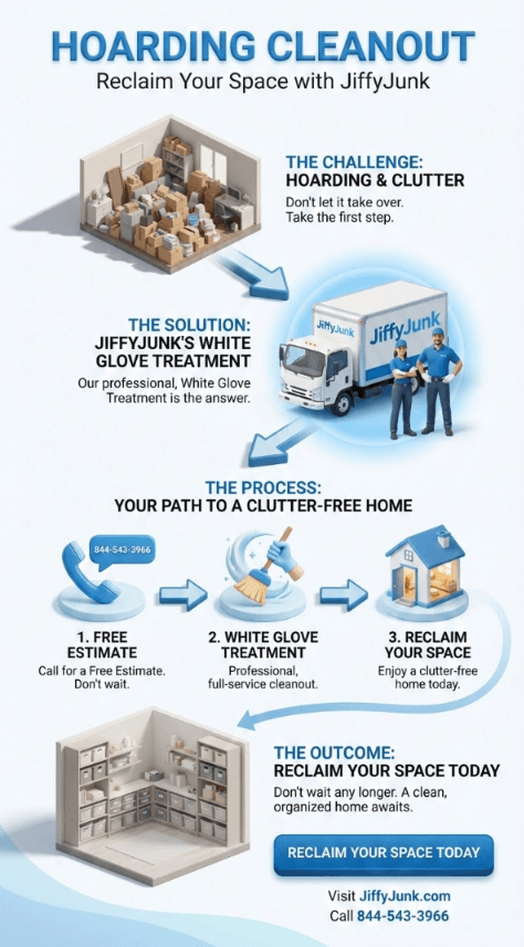 A hoarding cleanout service is professional junk removal designed to safely and compassionately clear spaces affected by excessive accumulation of belongings. Trained teams sort, remove, donate, recycle, and dispose of items responsibly, working at the client’s pace and with full discretion. Jiffy Junk provides hoarding cleanout services nationwide, covering full-property hoarder house cleanouts, room-by-room removal, estate cleanouts, and storage unit cleanouts. Every job is judgment-free, fully licensed and insured, and backed by the Jiffy Junk White Glove Treatment. To book a free estimate, call 844-543-3966 or visit JiffyJunk.com.